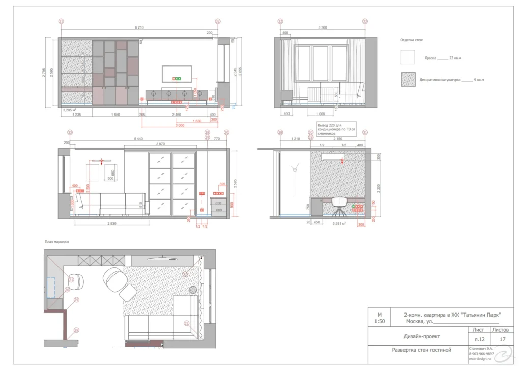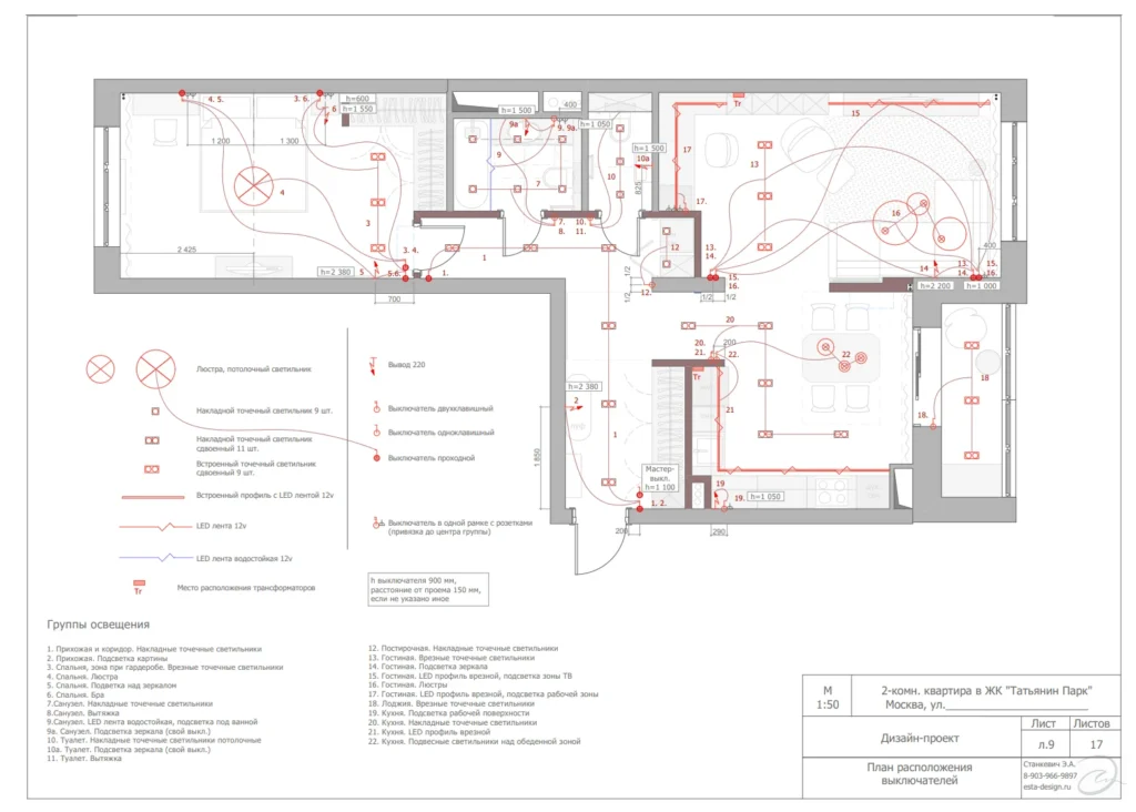 В процессе проектирования я пришлю планы розеток и выключателей со сценарием освещения, чтобы обсудить и утвердить их.